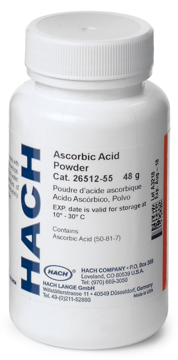 For determination of reactive phosphorus (phosphate) by the Rapid Liquid Ascorbic Acid Method. Hach Method 10055. Used with Ascorbic Acid Reagent Dilution Solution (2599949) and Molybdate Reagent Solution (2599849). 48 g bottle.